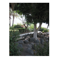 Il luogo era veramente di "beatitudine" per la magnifica vista sul mar di Galilea, la presenza in zona di numerosi banani ed in un giardino lussureggiante di prati, palme, fiori e bouganville.
